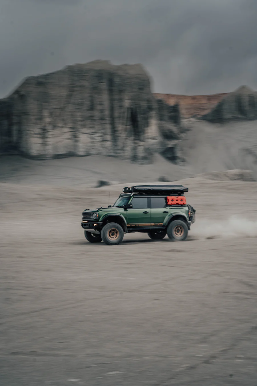 This product was engineered for Bronco users who like to drive spiritually off-road and those who carry large tents or heavy gear on the roof rack. Those who have 270 awnings or overhanging camping gear will greatly benefit from reinforcing their TRMR Rack for their Bronco. The Billet Reinforcement Brace will help with side to side weight shifts on the TRMR Rack and are recommended for users putting heavy loads on their TRMR Rack and/or Bronco drivers who love to drive spiritually.