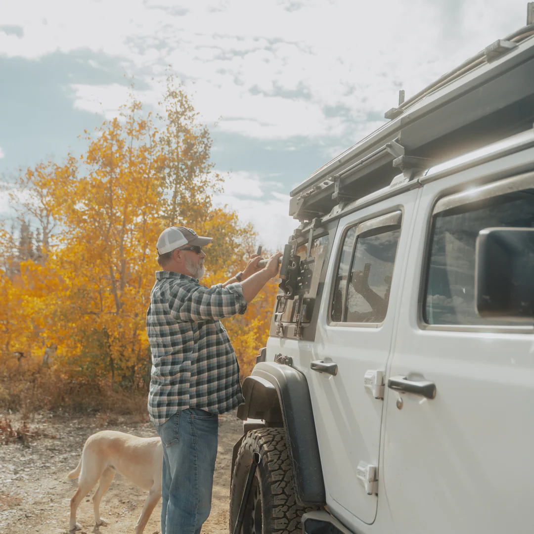 The Shovel and Axe mount from TrailRax offers independent opening flanges for each tool allowing you to get to the one tool you need at a time. This means tools will not be falling on you when you open the mount. The mount also has adjustable tightness on the hinges allowing the user to choose how freely the mount opens and closes.