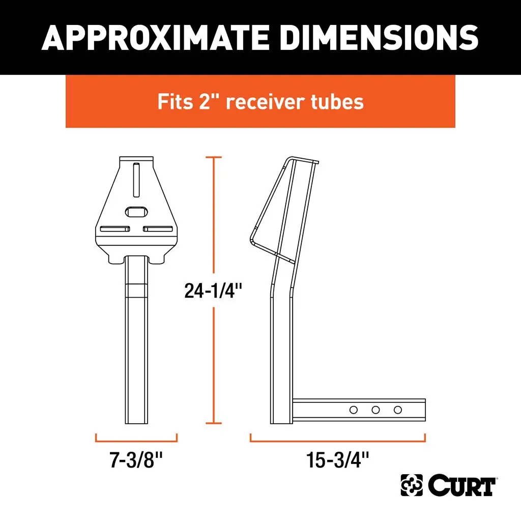 The Curt spare tire mount inserts into the 2" x 2" receiver tube opening of your trailer hitch and allows you to attach a spare tire onto the front end or rear of your truck, van or SUV. It measures 24" from top to bottom and features multiple mounting holes on the shank to provide plenty of clearance for your bumper and the rear of your vehicle. The CURT spare tire mount is designed to mount onto a variety of vehicles and to accept a number of different wheel types. It is especially useful for off-roading situations and for creating a little extra cargo room inside your vehicle (NOTE: Mounting hardware for the spare tire is not included).