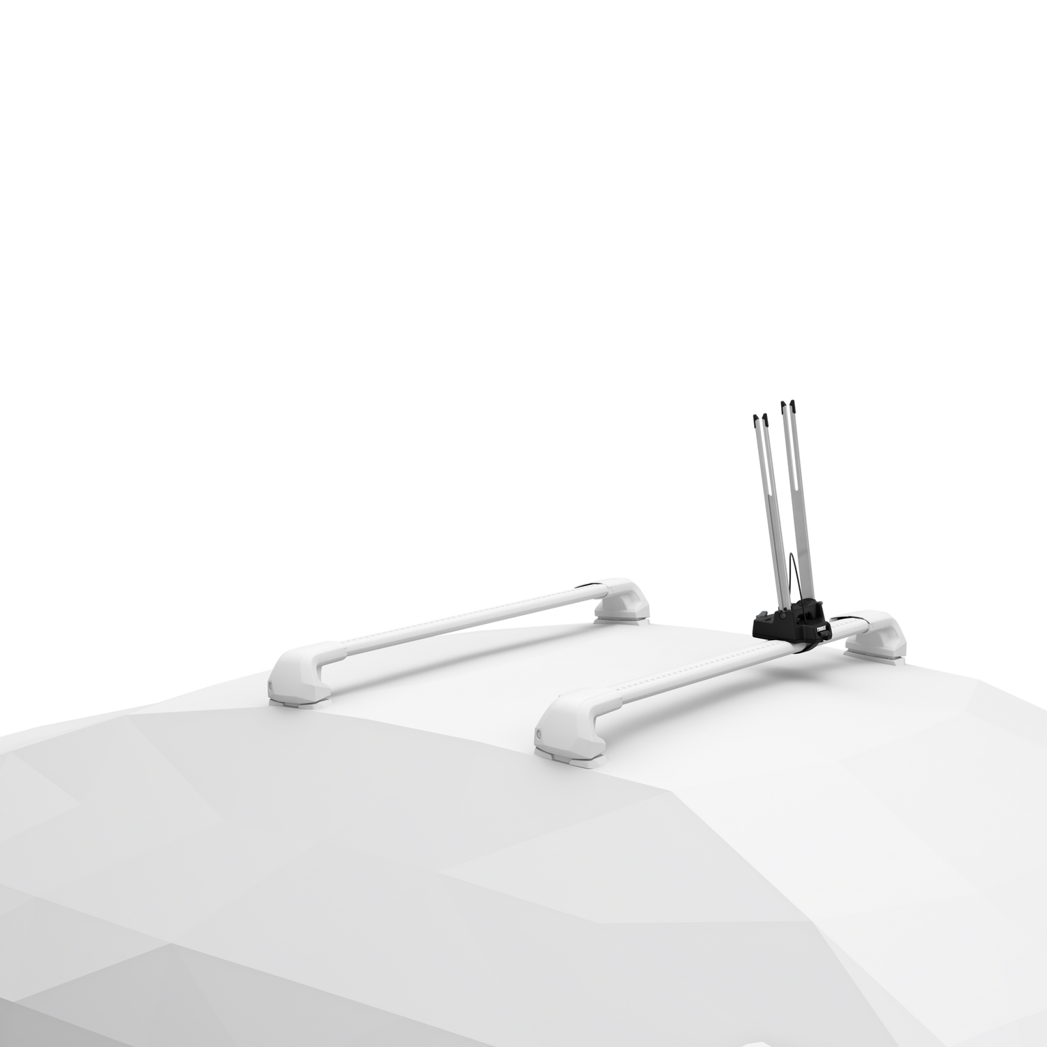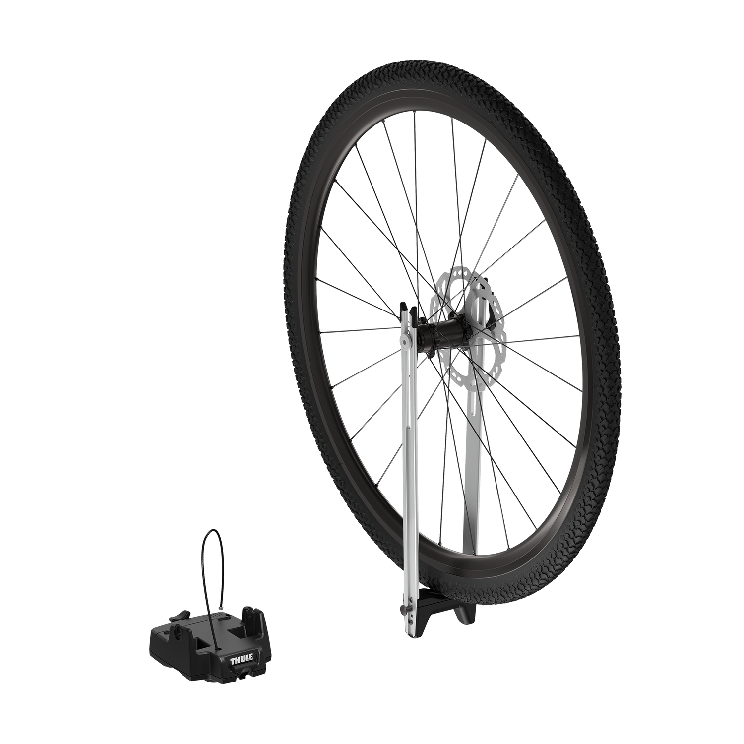 Secure and easy to use roof mounted bike front wheel holder keeps muddy and bulky wheel out of the trunk.