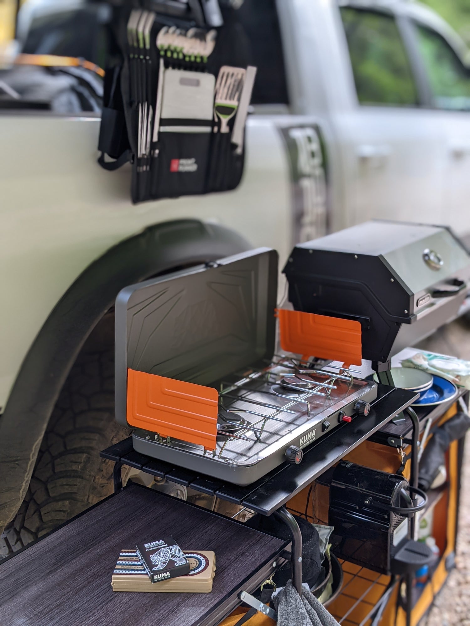 We must eat! What better way to cook than with this functional camp kitchen that will make any campsite chef happy. This collapsible and lightweight camp kitchen folds up and stores in a durable carry bag allowing you to bring extra storage and table space with you anywhere!